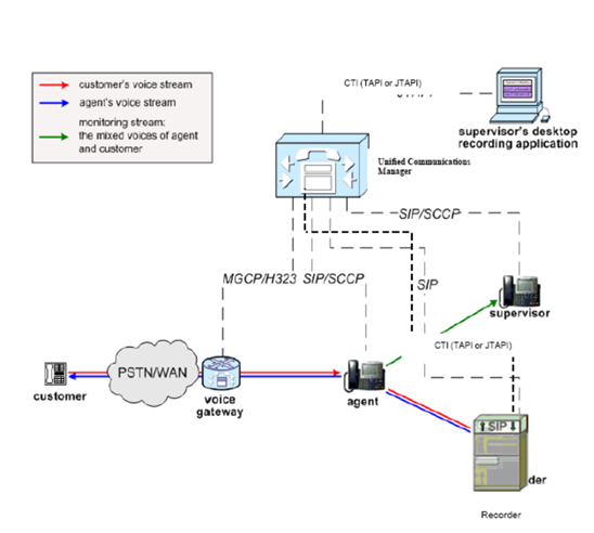 3、需要将CM的端口镜像到录音服务器或者采用CTI通过TAPI协议连接到CM,以获取主、被叫信息。